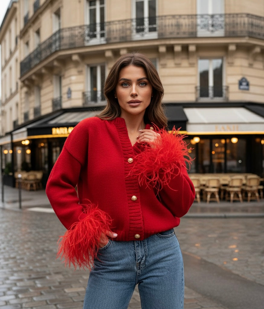 Ontdek de luxe van de Cardigan Pluméra, een veelzijdige cardigan die comfort en stijl perfect combineert. Gemaakt van hoogwaardig breimateriaal, voelt deze lichtgewicht cardigan heerlijk zacht aan op de huid. De verfijnde pluimdetails geven een unieke uitstraling, wat het een ideale keuze maakt voor elke gelegenheid. Draag hem open over een jurk voor een chique look of gesloten met een paar jeans voor een casual uitje.