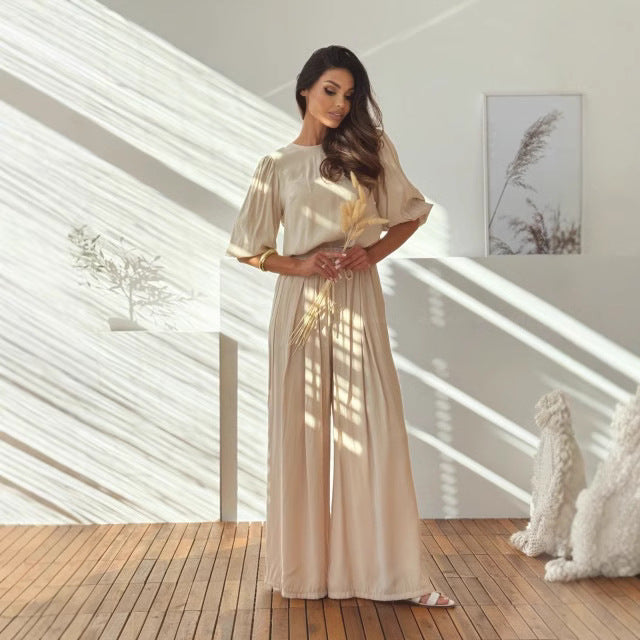Eleva's Two-Piece Set | Dames set met strik-T-shirt en wijde broek met elastische taille