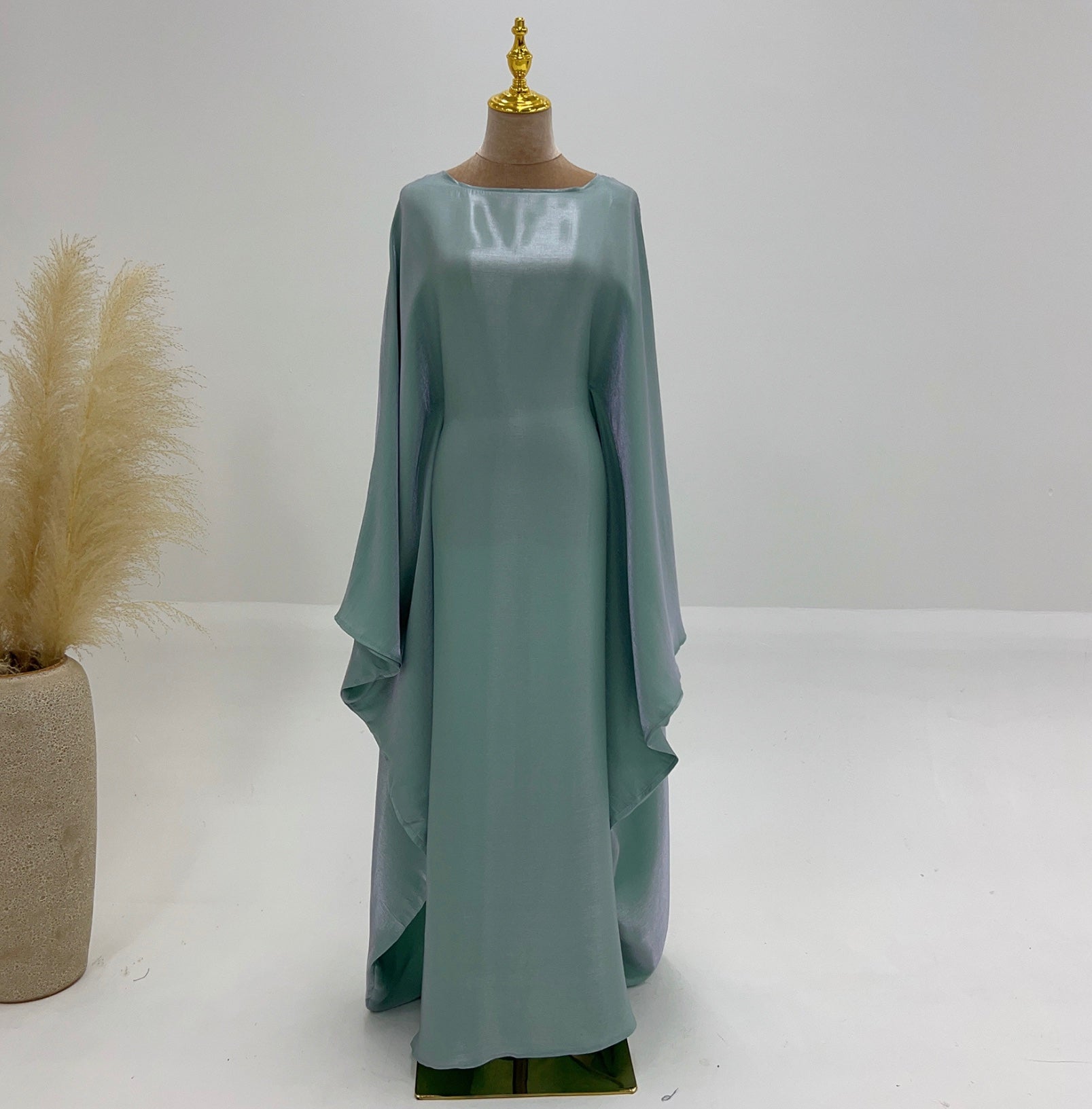 Deze elegante maxi jurk met vleermuismouwen en subtiele glans straalt moeiteloze klasse uit – ideaal voor formele gelegenheden.