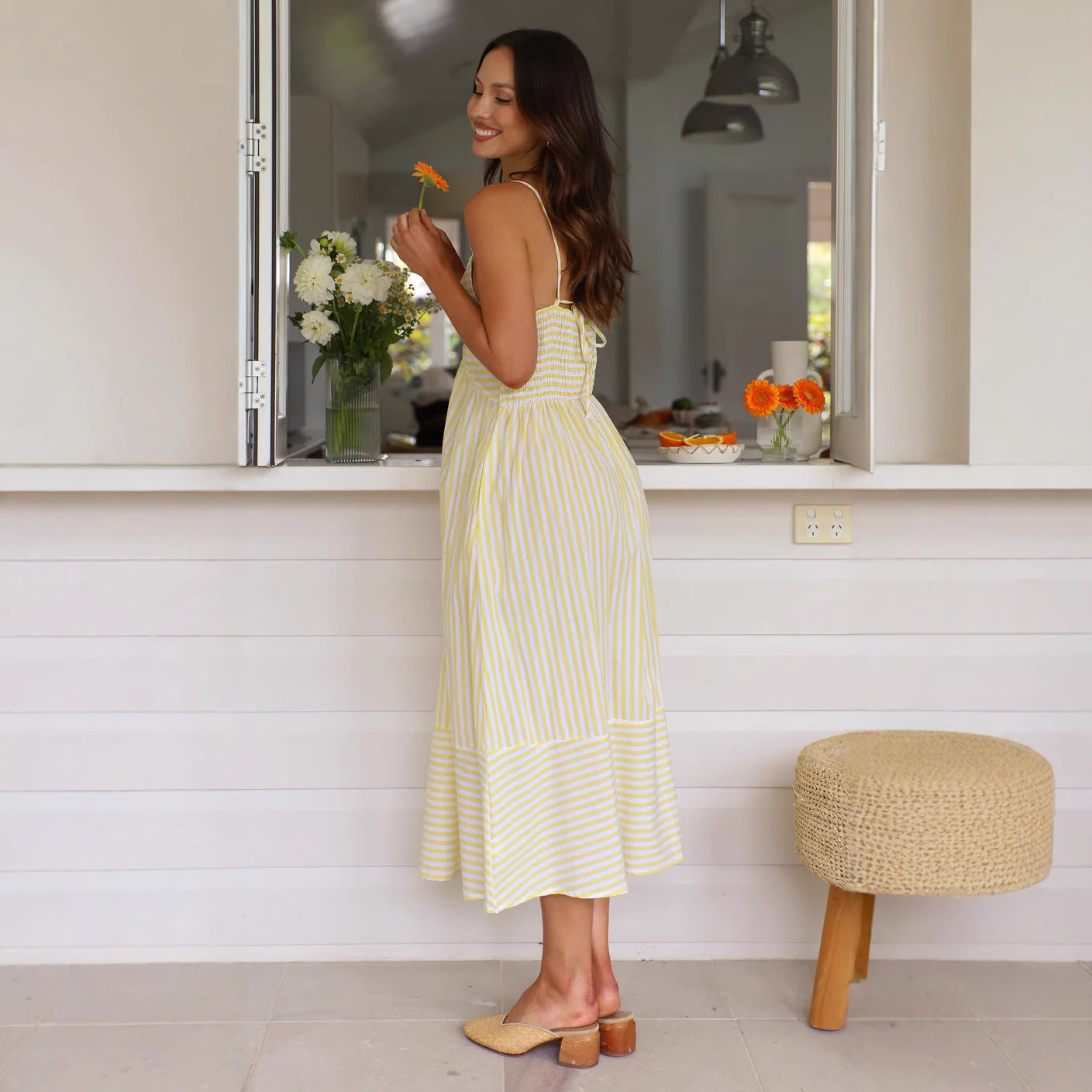 Midi Jurk voor Dames met Streepdesign en Luchtige Spaghettibandjes
